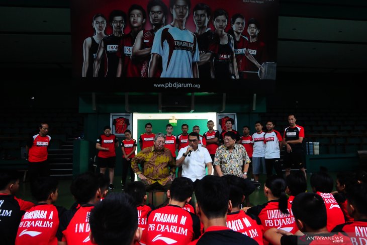 Kepala Staf Kepresidenan Moeldoko (tengah) memberikan motivasi kepada atlet bulutangkis hasil audisi umum bulutangkis saat kunjungan di GOR PB Djarum, Kudus, Jawa Tengah, Kamis (12/9/2019). Dalam kunjungan itu, Moeldoko menegaskan bahwa tidak ada tindak eksploitasi anak di PB Djarum serta meminta agar audisi umum beasiswa bulu tangkis tetap dilanjutkan di tahun 2020 dan dirinya siap memfasilitasi pertemuan antara Komisi Perlindungan Anak Indonesia (KPAI) dengan PB Djarum untuk mediasi. (Feed) FOTO/Yusuf Nugroho/aww.