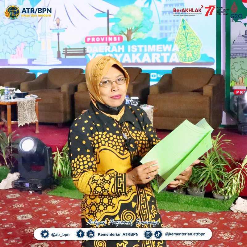 AGRARIA.TODAY – Manfaat sertipikat tanah dapat dirasakan oleh siapa saja, tak terbatas pada gender. Sri Lestari (60 tahun), seorang ibu sekaligus pemilik usaha warung dan laundry di Desa Siyono Kulon, Gunungkidul, Yogyakarta adalah buktinya. Pada Minggu (24/07/2022) ia resmi menjadi pemilik tanah yang telah berkekuatan hukum. “Alhamdulillah. Bersyukur sekali. Enggak nyangka,” ucapnya ketika ditemui di Hotel Grand Inna Malioboro, Yogyakarta dalam acara Sosialisasi Program Strategis Kementerian Agraria dan Tata Ruang/Badan Pertanahan Nasional (ATR/BPN) bersama Komisi II Dewan Perwakilan Rakyat Republik Indonesia (DPR RI)